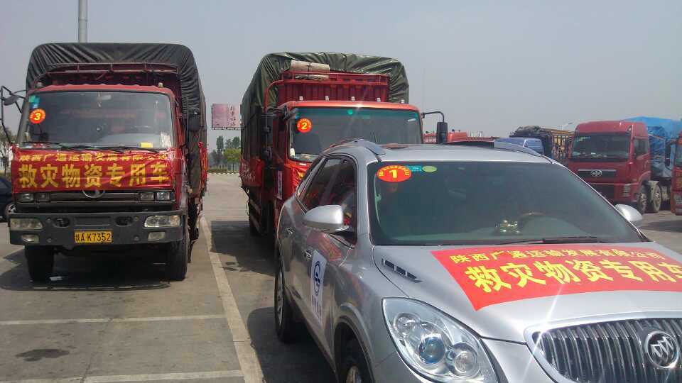 陜西廣通運(yùn)輸發(fā)展有限公司救援物資車隊于4月25日凌晨三點(diǎn)左右,抵達(dá)雅安市雨城區(qū)多營鎮(zhèn)的物資集中配送點(diǎn)。本次救援物資運(yùn)送車隊由五輛大卡組成,共運(yùn)送了價值十多萬元的救災(zāi)急需物資四十余噸;行程八百五十公里;用時十八小時。到達(dá)雅安物資集中配送點(diǎn)后,當(dāng)?shù)毓ど滩块T對這批物資進(jìn)行了檢驗(yàn)、登記。經(jīng)過四小時的緊急卸載,車隊于中午十二點(diǎn)離開雅安。