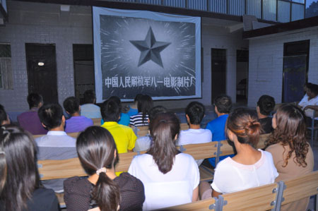 7月15日晚,廣通之家的小院內(nèi)座無(wú)虛席,黃陵縣店頭鎮(zhèn)文化站的同志正在為觀(guān)眾們播放紅色經(jīng)典電影《地雷戰(zhàn)》和《東進(jìn)序曲》,經(jīng)典的電影片段不時(shí)博得現(xiàn)場(chǎng)觀(guān)眾的熱烈掌聲和陣陣歡笑。